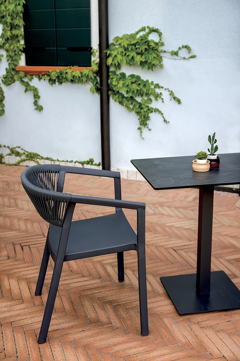 tipologia: poltrona in plastica (polipropilene) con aggiunta di fibra di vetro, rivestita in corda per esterno. Impilabile.